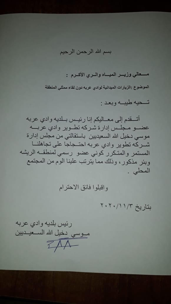 رؤساء بلديات وادي عربة وقطر وقريقره يقدمون استقالاتهم ويطالبون بإلغاء شركة تطوير وادي عربة