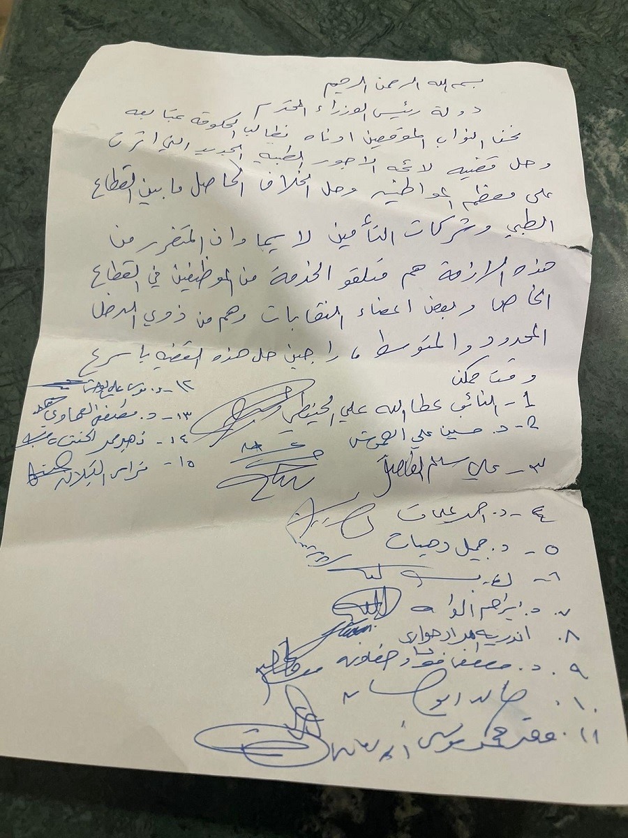 وقع نواب اليوم الاثنين أول مذكرة نيابية موجهة إلى رئيس الوزراء جعفر حسان. والمذكرة تطالب حسان بحل قضية لائحة الأجور الطبية التي أشعلت خلافا بين نقابة الأطباء وشركات التأمين ومزودي الخدمة الطبية.