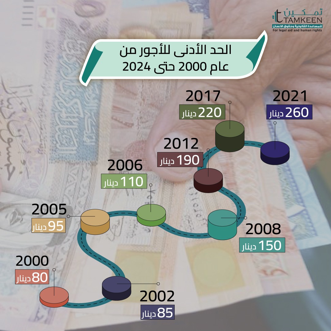 طالب مرصد الحماية الاحتماعية التابع لـ"تمكين" بضرورة رفع الحدّ الأدنى للأجور في الأردنّ بما يتناسب مع معدّلات التضخّم وتكاليف المعيشة، استنادًا إلى المادّة (52) من قانون العمل الّتي تنصّ على وجوب احتساب الحدّ الأدنى للأجور بناء على مؤشّرات تكاليف المعيشة. وأوضح "مرصد الحماية" في بيان صادر عنه أنّ معدّلات التضخّم في الأردنّ بلغت 4.23% في عام 2022، و2.08% في عام 2023، ومن المتوقّع أن تسجّل 2% في عام 2024. بناء على ذلك، يرى "المرصد" أنّ رفع الحدّ الأدنى للأجور بنسبة تراكميّة تبلغ 8%، أي ما يعادل زيادة قدرها 20 دينارًا، ليصبح 280 دينارًا اعتبارًا من بداية عام 2025، هو استحقاق قانونيّ. ومع ذلك، شدّد "المرصد" على أنّ اعتماد معدّلات التضخّم فقط غير كاف، داعية إلى احتساب الأجور بناء على التكاليف الحقيقيّة للمعيشة الّتي تشمل الغذاء، السكن، المواصلات، الرعاية الصحّيّة، والتعليم. وفقًا لورقة موقف صادرة عن "مرصد الحماية" التابع لـ"تمكين" بعنوان "حدّ الكفاف 2: الحدّ الأدنى للأجور في الأردنّ"، تبلغ تكلفة المعيشة الشهريّة لعائلة مكوّنة من أربعة أفراد حوالي 1843 دينارًا دون احتساب إيجار السكن، بمعدّل 520 دينارًا للفرد. بينما يتراوح إيجار شقّة صغيرة بين 200 و300 دينار، وأشارت الورقة إلى أنّ الحدّ الأدنى الحاليّ للأجور البالغ 260 دينارًا لا يغطّي حتّى الحدّ الأدنى من المتطلّبات الأساسيّة، كما استندت الورقة إلى أرقام خطّ الفقر المطلق للأسرة المعياريّة (4.8 فرد)، الّذي يبلغ وفق الأرقام الرسميّة 480 دينارًا شهريًّا. أمّا خطّ الفقر العامّ المطلق (الغذائيّ وغير الغذائيّ) فقد بلغ 813.7 دينارًا للفرد سنويًّا (68 دينارًا شهريًّا)، في حين بلغ خطّ الفقر المدقع (الغذائيّ) 336 دينارًا سنويًّا (28 دينارًا شهريًّا)، وبيّنت الورقة أن تجاهل آليّة كلفة المعيشة واستبدالها بمعدّل التضخّم فقط لا يعكس الصورة الكاملة للأوضاع الاقتصاديّة للعاملين. وتشير الورقة إلى أنّ آخر تقرير رسميّ عن الفقر في الأردنّ صدر عام 2010، وأظهر أنّ معدّل الفقر العامّ المطلق بلغ حوالي 14.4%. ومع ذلك، ذلك، أظهرت تقديرات البنك الدوليّ لعام 2023 أنّ نسبة السكّان تحت خطّ الفقر تصل إلى 35%، أي ما يعادل نحو 3.98 مليون شخص من أصل 11.3 مليون نسمة. وقدّر البنك الدوليّ خطّ الفقر للفرد الواحد بـ5.60 دينار يوميًّا. وأوضحت الورقة أنّ الحكومة لم تعلن عن نسب الفقر الحقيقيّة منذ أكثر من 13 عامًا، ممّا يعكس تجنّبها مواجهة المسؤوليّة عن الأوضاع الاقتصاديّة الصعبة. كما أشارت إلى أنّ معادلة احتساب نسبة الفقر تعتمد على إنفاق الأسر عوضًا عن دخلها، مّا قد يؤدّي إلى تقديم صورة غير دقيقة عن معدّلات الفقر، ذلك لأنّ الأسر الأردنيّة حسب ما جاء في الورقة غالبًا ما تنفق أكثر ممّا تكسب، وتعتمد في ذلك على مصادر تمويل إضافيّة مثل القروض وبيع الأصول والممتلكات. وأكّد "مرصد الحماية" في الورقة الصادرة عنه على أنّ تحديد الحدّ الأدنى للأجور هو من أهمّ السياسات لضمان مستوى معيشيّ لائق للعاملين. وأشارت إلى أنّ بعض الدول تعتمد مفهوم "سلّة السلع" لتحديد الأجر الأدنى، بحيث تغطّي السلّة الاحتياجات الأساسيّة مثل السكن، الطعام، التعليم، النقل، والرعاية الصحّيّة. وطرحت الورقة تساؤلًا حول ما إذا كان الحدّ الأدنى الحاليّ للأجور البالغ 260 دينارًا كافيًا لتغطية هذه الاحتياجات، حتّى مع الزيادة المقترحة إلى 280 دينارًا، مؤكّدة أنّ ارتفاع تكاليف المعيشة يجعل من الصعب تحقيق ذلك. وفيما يتعلّق بالعمّال غير الأردنيّين، أشارت الورقة إلى أنّهم يواجهون تحدّيات كبيرة فيما يتعلّق بالحدّ الأدنى للأجور، مشيرة إلى أنّهم تعرّضوا لتمييز واضح في سياسات رفع الأجور. ففي عامي 2012 و2017، استثني العمّال غير الأردنيّين من الزيادات الّتي أقرّت للعمّال الأردنيّين. وفي عام 2021، اتّخذ قرار بمساواة الحدّ الأدنى للأجور بين الأردنيّين وغير الأردنيّين تدريجيًّا على مدار عامين، لكنّ بعض القطاعات مثل قطاع الألبسة والمنسوجات استثنيت من هذا الق