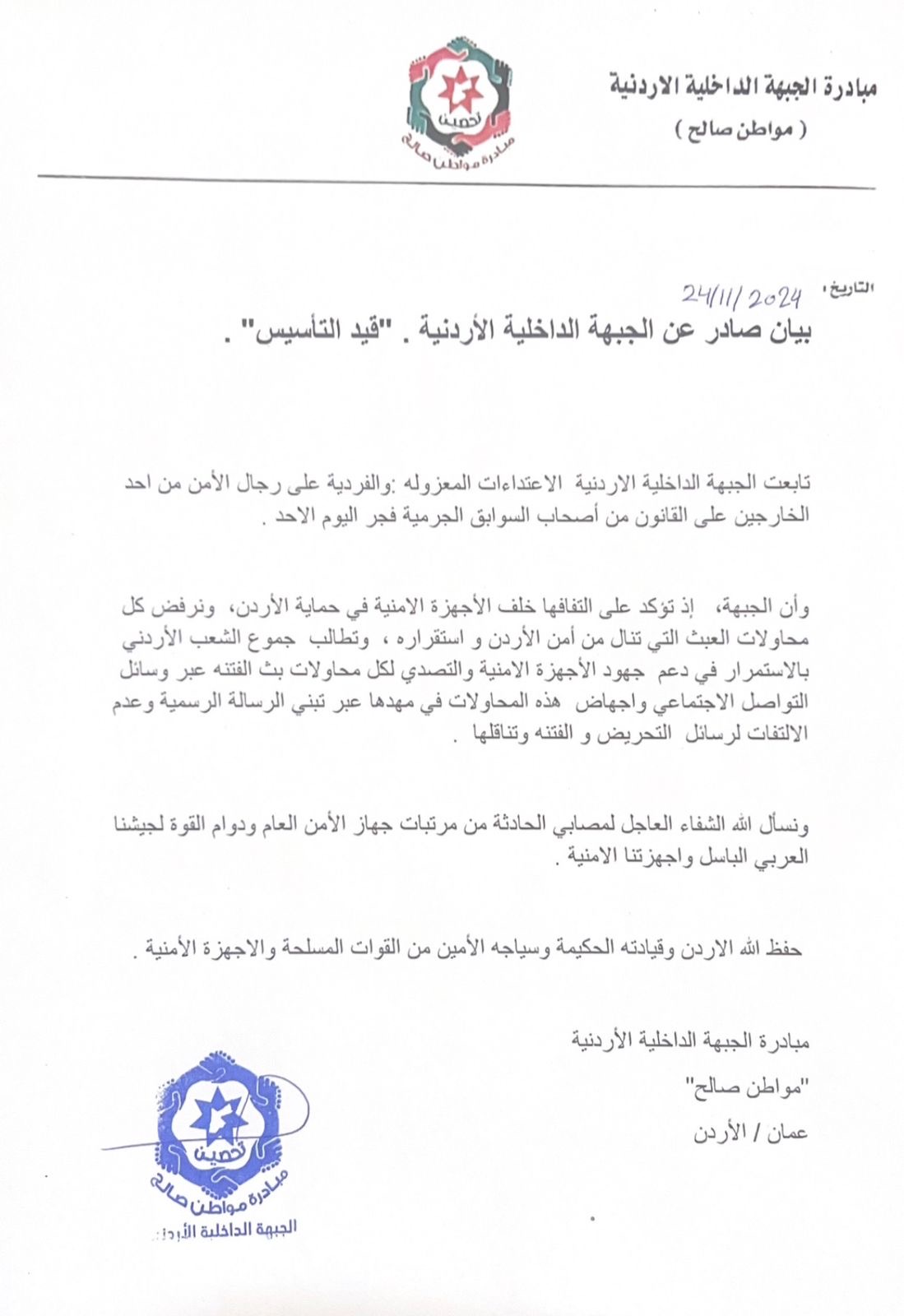 عاجل - بيان صادر عن الجبهة الداخلية الأردنية . "قيد التأسيس" ( وثيقة )