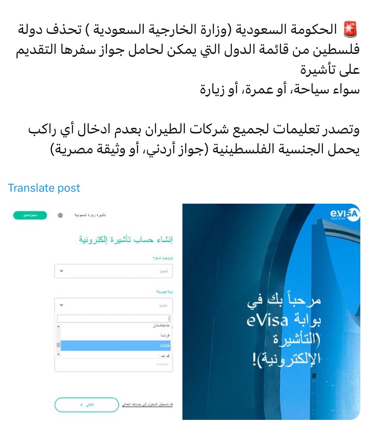 ومن الجدير ذكره ان منصة التأشيرات الالكترونية السعودية مدرج عليها الان اسم دولة فلسطين خلافا لما تم تداوله من حسابات يعتقد انها مغرضة وغير صحيحة