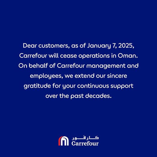 وجاء في البيان: "عملاءنا الكرام، اعتباراً من تاريخ 7 يناير 2025، ستتوقف عمليات كارفور في سلطنة عُمان. بالنيابة عن إدارة وموظفي كارفور، نتقدم إليكم بجزيل الشكر والامتنان على دعمكم الذي استمر على مدار العقود الماضية. ودمتم بخير وعافية". يُشار إلى أن سلطنة عُمان هي ثاني دولة عربية تُغلق فيها كارفور فروعها بعد الأردن، حيث أُعلنت نهاية عملياتها هناك بتاريخ 4 نوفمبر 2024.
