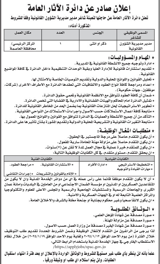 كما اعلنت دائرة الاثار العامة عن حاجتها لـ "مدير مديرية الشؤون القانونية"