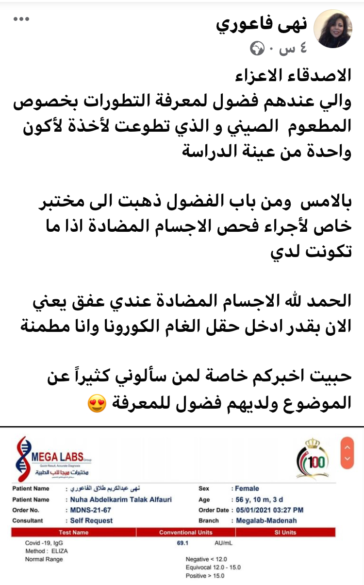 نشرت الناشطة الاجتماعية نهى الفاعوري والتي تطوعت مسبقا وأبنتها لأخذ اللقاح الإماراتي المضاد لفيروس كورونا عبر صفحتها على الفيسبوك قائلة :