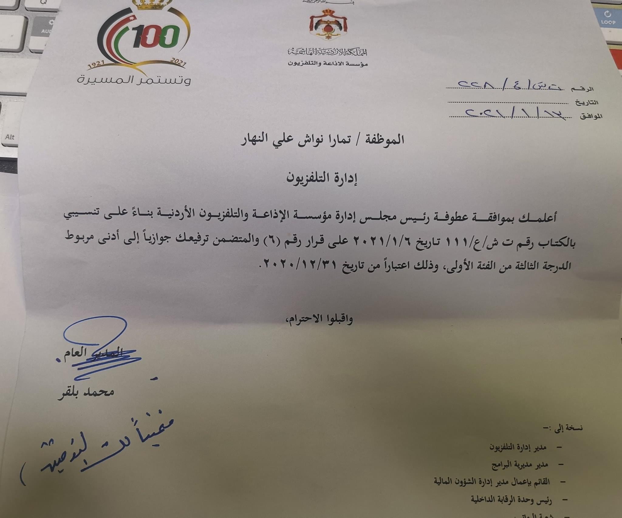 اسرة بلكي الاخباري تتقدم من الزميلة تمارا نواش النهار من ملاك مؤسسة الاذاعة والتلفزيون بالتهنئة والتبريك بمناسبة الترقية وترفيعها الى الدرجة الثالثة من الفئة الاولى .