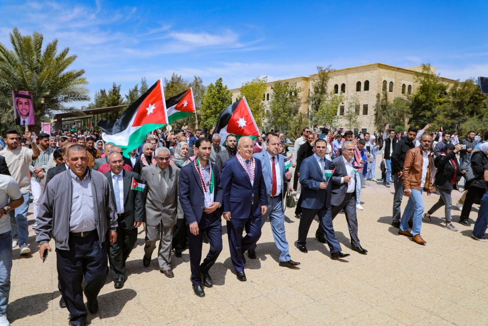قد شارك في المسيرة الاحتفالية فرسان وموسيقات الأمن العام، الذين أضفوا بأهازيجهم الوطنية طابعًا مميزًا على الفعاليات، وترددت الهتافات التي تُجسد روح الفخر والانتماء، في تعبير صادق عن حب الوطن وقائده، كما شهدت الجامعة تزيين مداخلها وأروقتها بالأعلام الأردنية، وسط أجواء من الحماس والبهجة التي غمرت الجميع، ليؤكدوا أن الأردن سيظل مرفوع الرأس، محميًا بسواعد أبنائه الذين لا يدخرون جهدًا في سبيل إعلاء شأنه.
