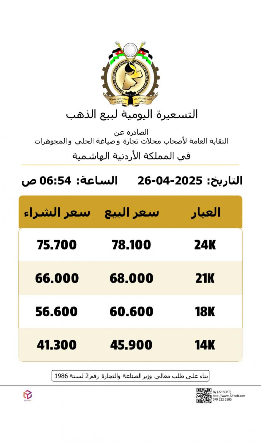 وبحسب التسعيرة، بلغ سعر بيع الغرام من الذهب عيار 21، الأكثر طلبًا لدى الأردنيين في السوق المحلي، 68 دينارًا، مقابل 66 دينارًا للشراء.