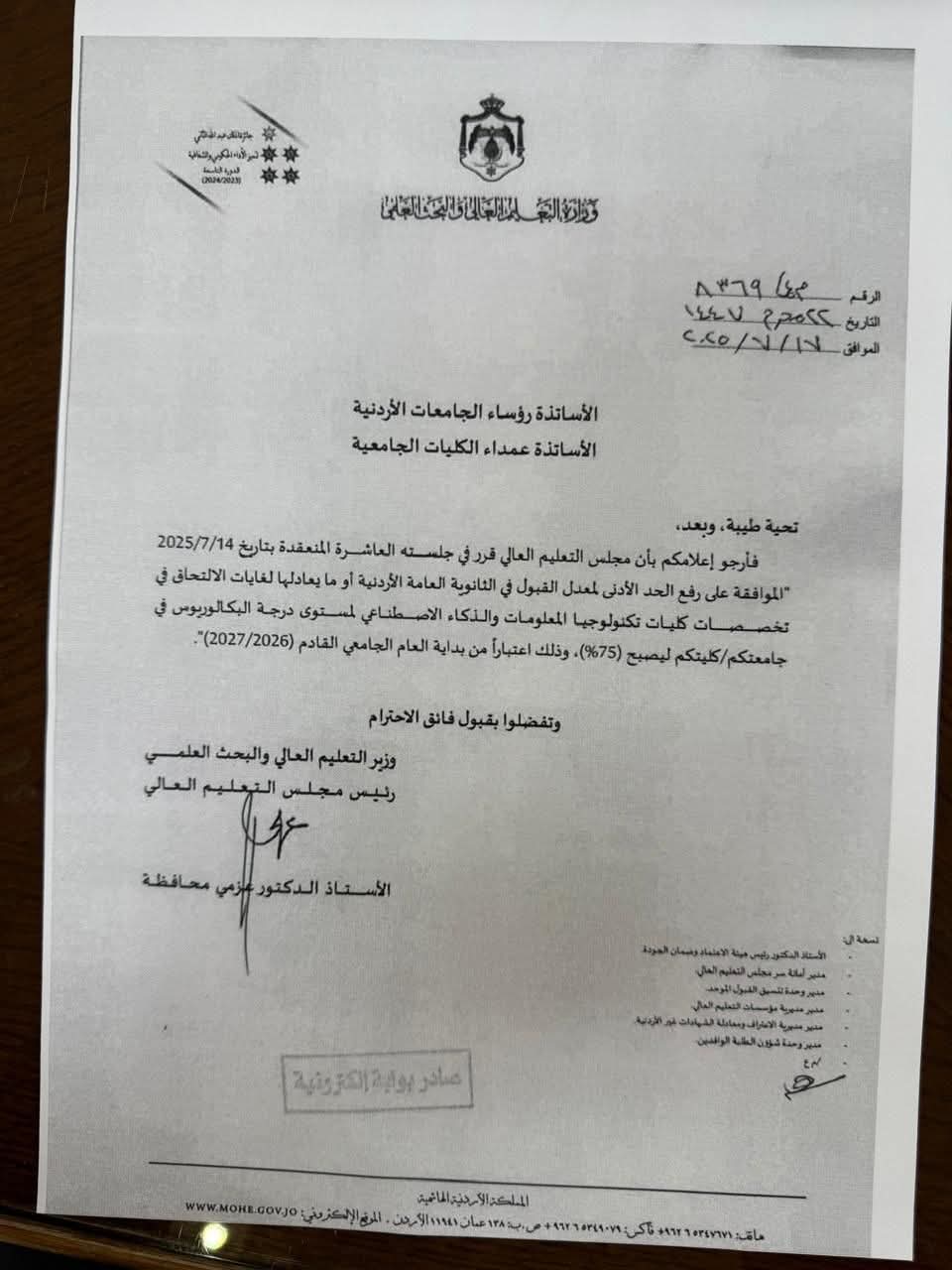 أصدر وزير التعليم العالي والبحث العلمي الدكتور عزمي محافظة تعميما، إلى عمداء الكليات الجامعية يقضي برفع الحد الأدنى لمعدل القبول في الثانوية العامة الأردنية أو ما يعادلها لغايات الالتحاق في تخصصات كليات تكنولوجيا المعلومات والذكاء الاصطناعي المستوى درجة البكالوريوس ليصبح (75%)، وذلك اعتباراً من بداية العام الجامعي القادم (2027/2026).