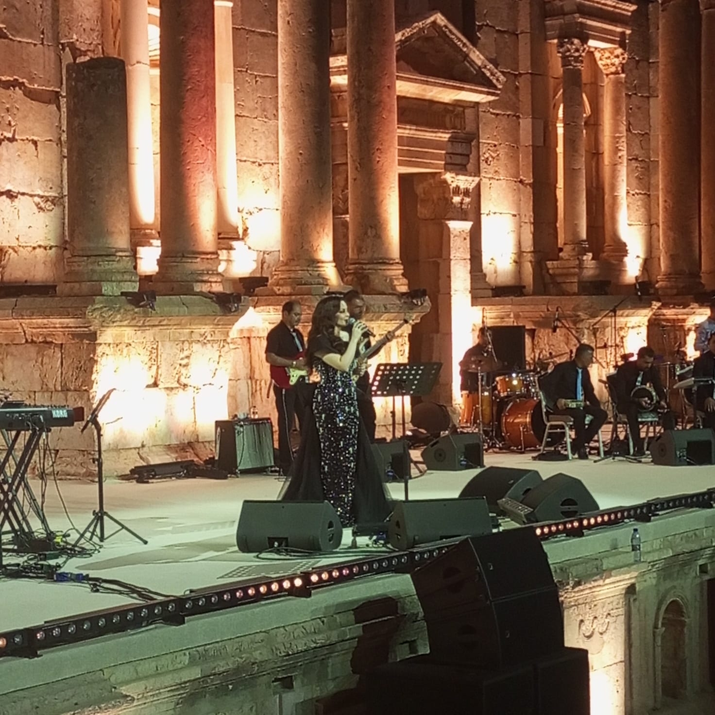 وخاطبت جمهورها بمساء الورد والأردن الحبيب واشادت بالحضور الجماهيري الكبير في المسرح ورحبت بالفرقة الموسيقية ، واكملت حفلتها بأغنية " حنا كبار البلد" ليكون الجمهور شريكا لها في ترديد الاغنية ، وذهبت إلى المواويل الوطنية لتذهب الى اغنية علمنا عالي ، حيث ابدعت في تحريك الجمهور وتفعيله مع كل نغمة على المسرح وعبر إيقاع أغانيها .