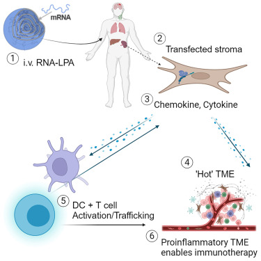 قام الباحثون بحقن دفعة قصيرة من mRNA عام (غير مخصص لطفرات ورمية بعينها) داخل جسيمات دهنية نانوية (LNP)، والتي بدورها تُفعّل الإنترفيرون من النوع الأول وتُطلق «جرس الإنذار»، مما يدفع الجهاز المناعي للتحرك فورًا.