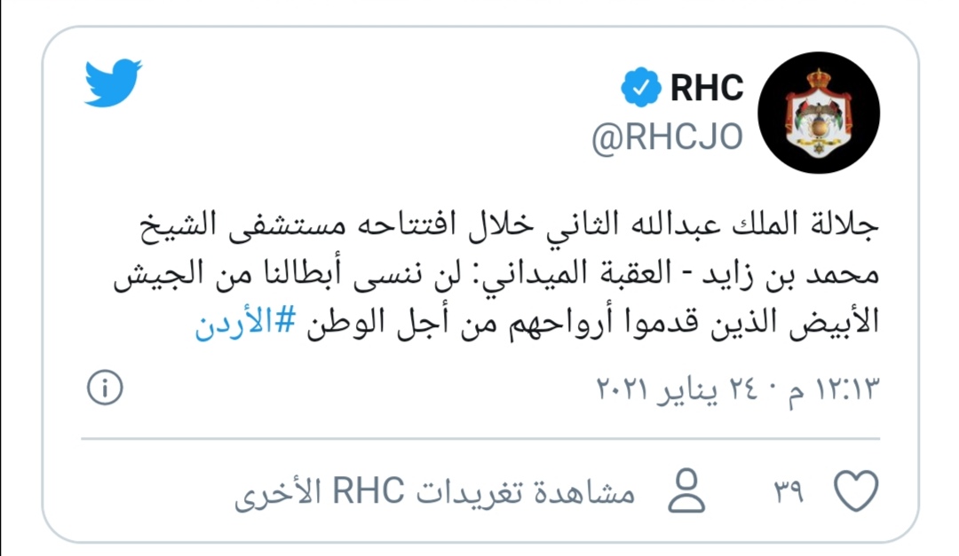جلالة الملك عبدالله الثاني خلال افتتاحه مستشفى الشيخ محمد بن زايد - العقبة الميداني: لن ننسى أبطالنا من الجيش الأبيض الذين قدموا أرواحهم من أجل الوطن