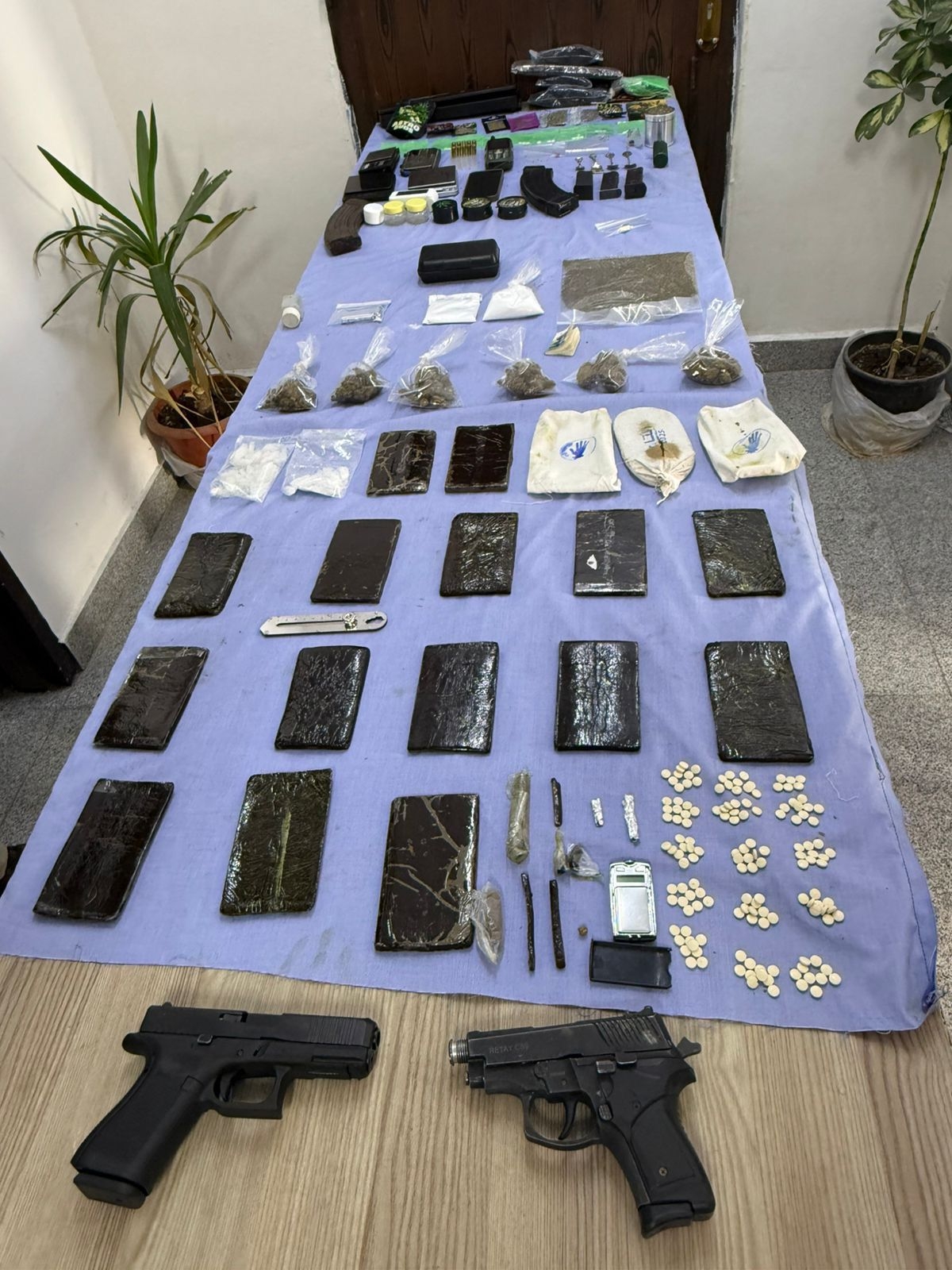 وفي محافطة جرش وبعد جمع المعلومات حول احد تجار المخدرات والتأكد من قيامه بنقل كمية من المواد المخدرة من لواء الرمثا باتجاه محافظة جرش برفقه شخص اخر وجرى مداهمتهما والقاء القبض عليهما وضبط بحوزتهما 40 كف حشيش ،فيما دوهم في محافظة الزرقاء مروج للمخدرات وضبطت بحوزته 6 كفوف حشيش .