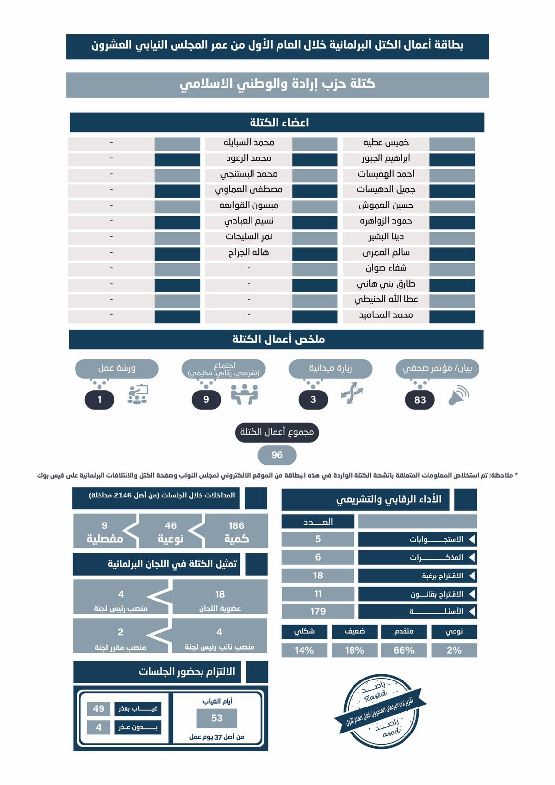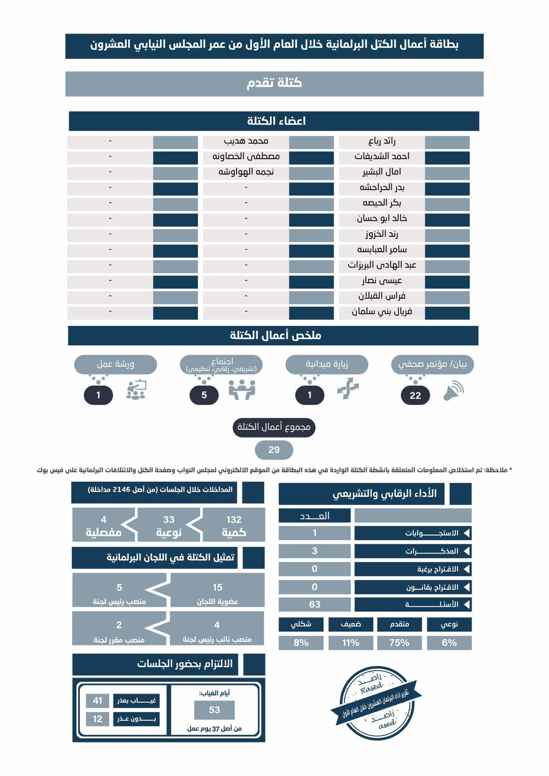 وبتحليل البيانات المرتبطة بأداء الكتل البرلمانية يتبين أن عدد الأنشطة والفعاليات والبيانات والزيارات التي نقذتها الكتل البرلمانية وصلت إلى 321 نشاطاً وفعالية وبياناً وزيارة، حيث كانت كتلة عزم الأعلى بتعداد الأنشطة بواقع 127 نشاطاً منهم 13 اجتماعاً و86 بياناً أو مؤتمراً صحفياً و20 زيارة ميدانية و8 ورشات عمل، تلتها كتلة حزب إرادة والوطني الإسلامي بواقع 96 نشاطاً، منهم 9 اجتماعات و83 بياناً أو مؤتمراً صحفياً و3 زيارات ميدانية وورشة عمل واحدة، تلاهم كتلة اتحاد الأحزاب الوسطية حيث نفذوا 39 نشاطاً منهم 4 اجتماعات و25 بياناً أو مؤتمراً صحفياً و9 زيارات ميدانية وورشة عمل واحدة، يليهم كتلة تقدم ب29 نشاطاً منهم 5 اجتماعات و22 بياناً أو مؤتمراً صحفياً وزيارة ميدانية وورشة عمل، ثم حزب الميثاق بـ 25 نشاطاً منهم 4 اجتماعات و13 بياناً أو مؤتمراً صحفياً و7 زيارات ميدانية وورشة عمل، ثم كتلة حزب جبهة العمل الإسلامي بـ 5 أنشطة منهم اجتماعين و3 زيارات ميدانية، علماً بأن المعلومات تم استخلاصها من الموقع الالكتروني لمجلس النواب وصفحة الكتل والائتلافات النيابية على الفيسبوك.