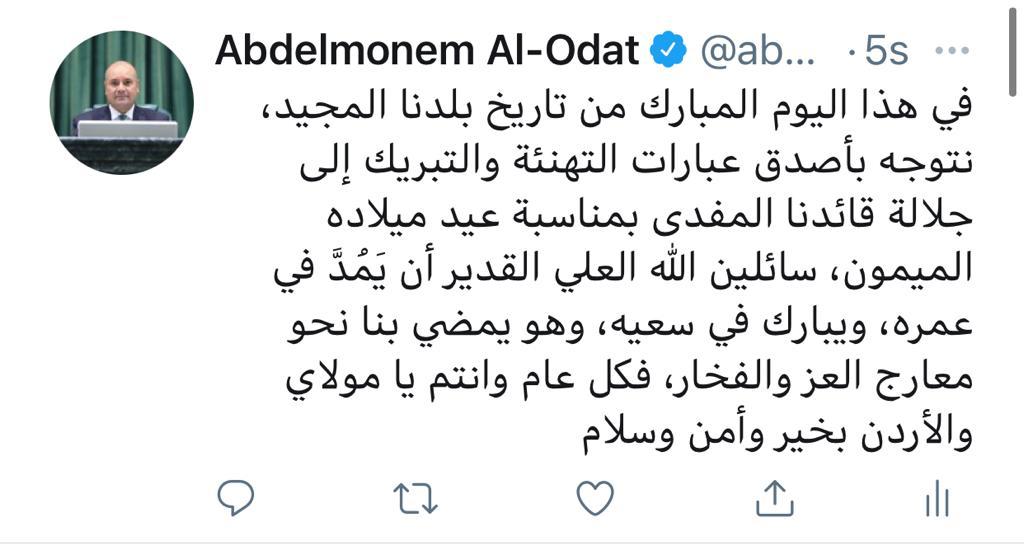 هنأ رئيس مجلس النواب المحامي عبد المنعم العودات جلالة الملك عبدالله الثاني ابن الحسين بعيد ميلاده التاسع و الخمسين الذي يصادف اليوم السبت.
