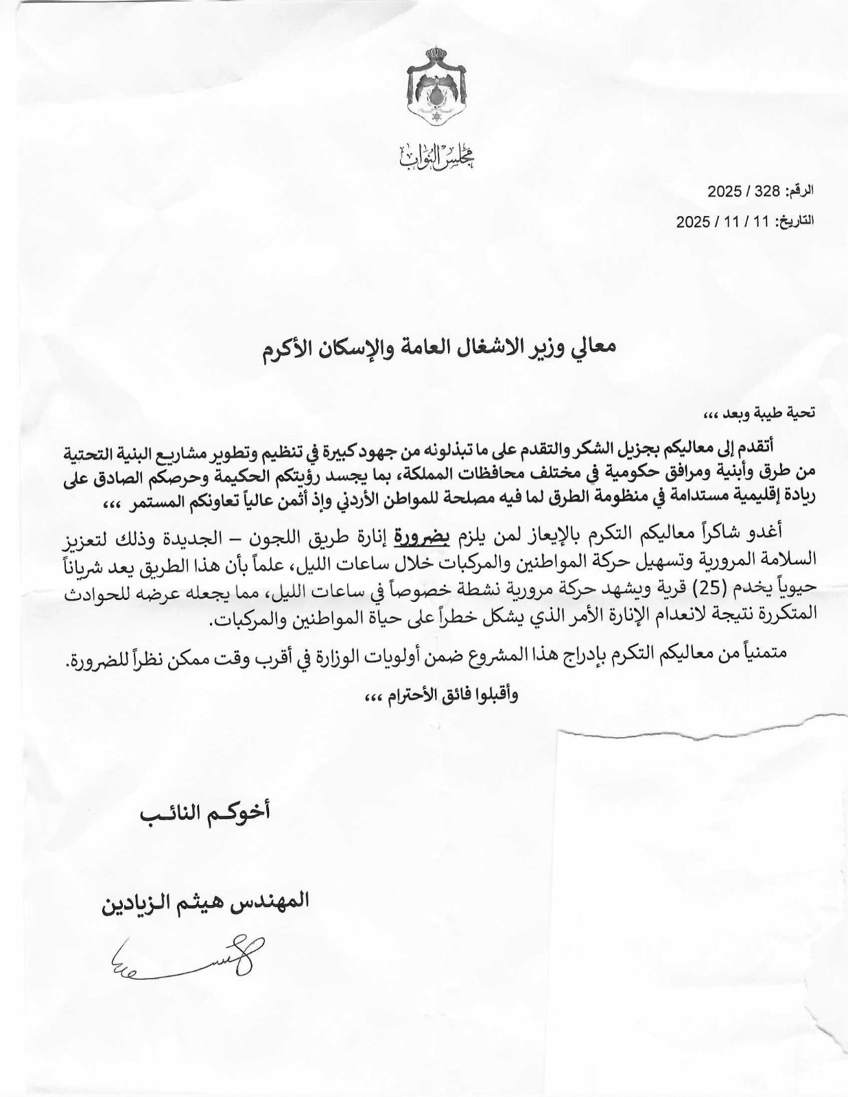 واختتم الزيادين مذكرته بمناشدة الوزير بإدراج هذا المشروع ضمن أولويات الوزارة العاجلة وفي أقرب وقت ممكن، نظراً للطابع الضروري الذي تقتضيه متطلبات السلامة العامة على الطريق.