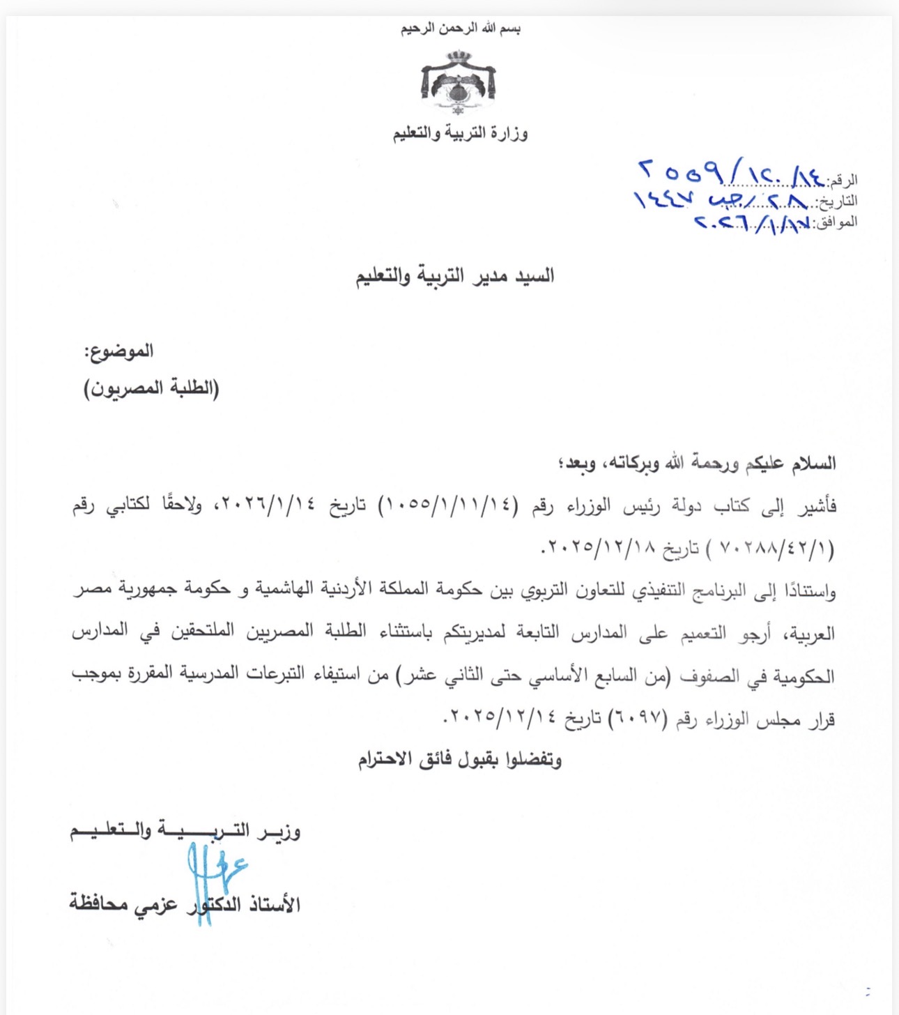 (وثيقة ) بموجب اتفاقية أردنية مصرية.. استثناء الطلبة المصريين من قرار مجلس الوزراء الخاص بالتبرعات المدرسية