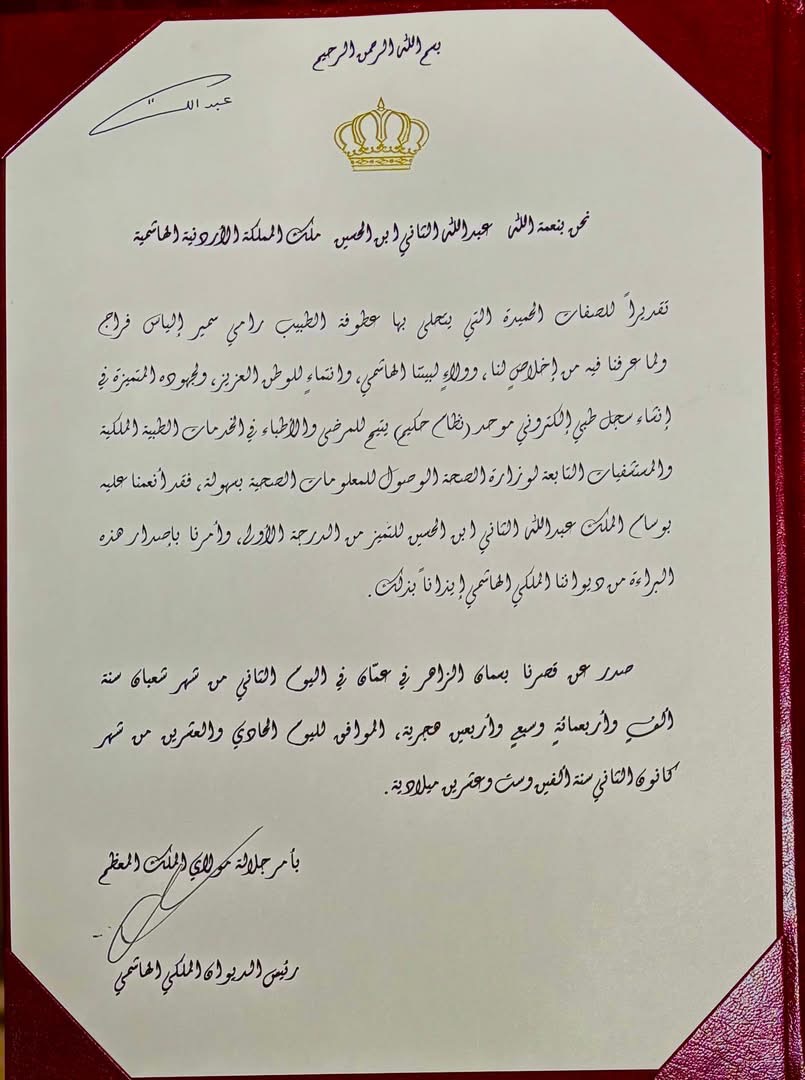 وفي ختام حديثه، شدد الدكتور فراج على أن هذا النجاح ما كان ليتحقق لولا الدعم الملكي المتواصل وتوجيهات جلالته للحكومات المتتالية بتبني هذه المبادرة، مقدماً الشكر الجزيل لفريق العمل في شركة الحوسبة الصحية بقيادة المدراء التنفيذيين غسان اللحام ورامي عدوان وفراس كمال وعمر عايش. وأكد أن الوسام الملكي الذي تسلمه يعد تقديراً لجهود هؤلاء المخلصين وعرفاناً من سيد البلاد بهذا الإنجاز الوطني الذي يجب الحفاظ عليه ومواصلة تطويره لخدمة الوطن والمواطن.