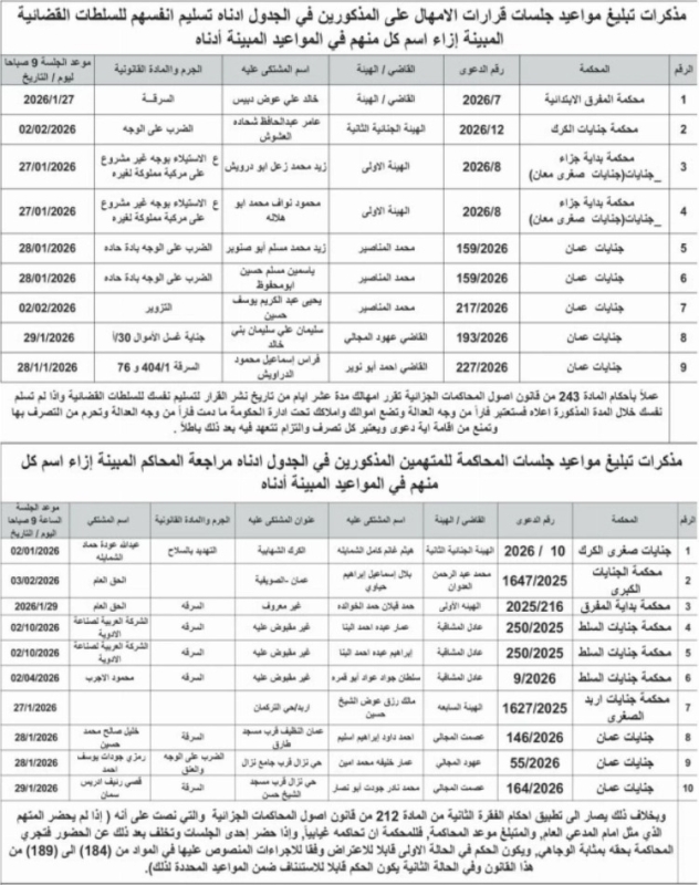السلطات القضائية تصدر مذكرات تبليغ لمطلوبين ومشتكى عليهم بمواعيد جلساتهم
