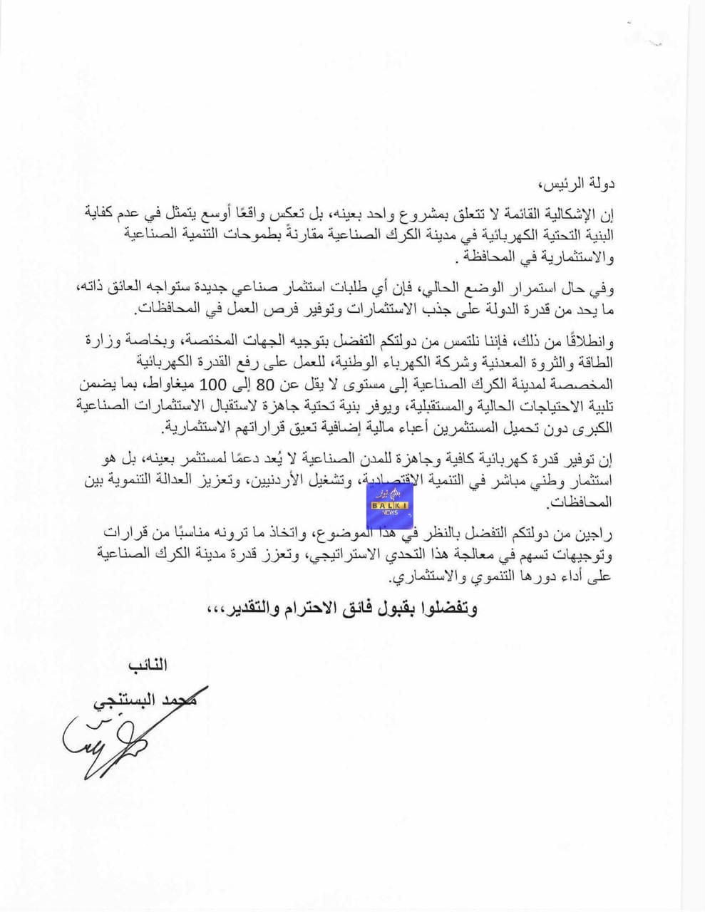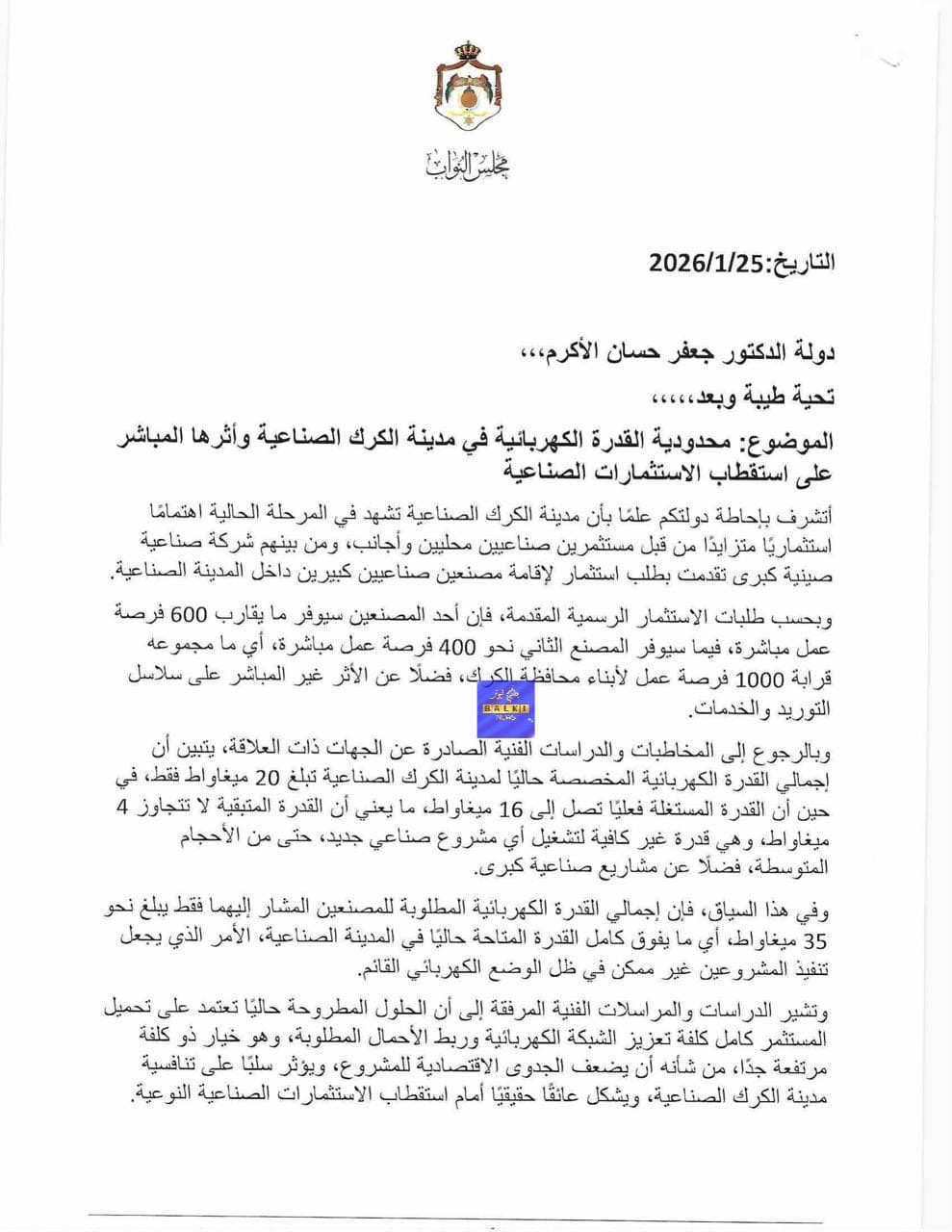 في متابعة حثيثة لملف التنمية في الجنوب، حصل موقع "بلكي نيوز" على وثيقة رسمية صادرة بتاريخ 25 كانون الثاني 2026، وجهها النائب محمد البستنجي إلى دولة رئيس الوزراء الدكتور جعفر حسان، كشف فيها عن "فضيحة" فنية وإدارية تعيق نهضة محافظة الكرك. النائب البستنجي، وفي انحياز تام لمصلحة أبناء محافظته، قرع ناقوس الخطر محذراً من ضياع استثمار صيني ضخم كان سيوفر 1000 فرصة عمل مباشرة، وذلك بسبب عجز البنية التحتية الكهربائية التي لم تعد قادرة على استيعاب أي مشروع جديد.
