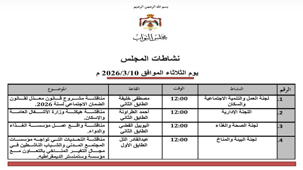 تناقش لجنة العمل والتنمية الاجتماعية والسكان النيابية، الثلاثاء، مشروع قانون مُعدّل لقانون الضمان الاجتماعي لسنة 2026.