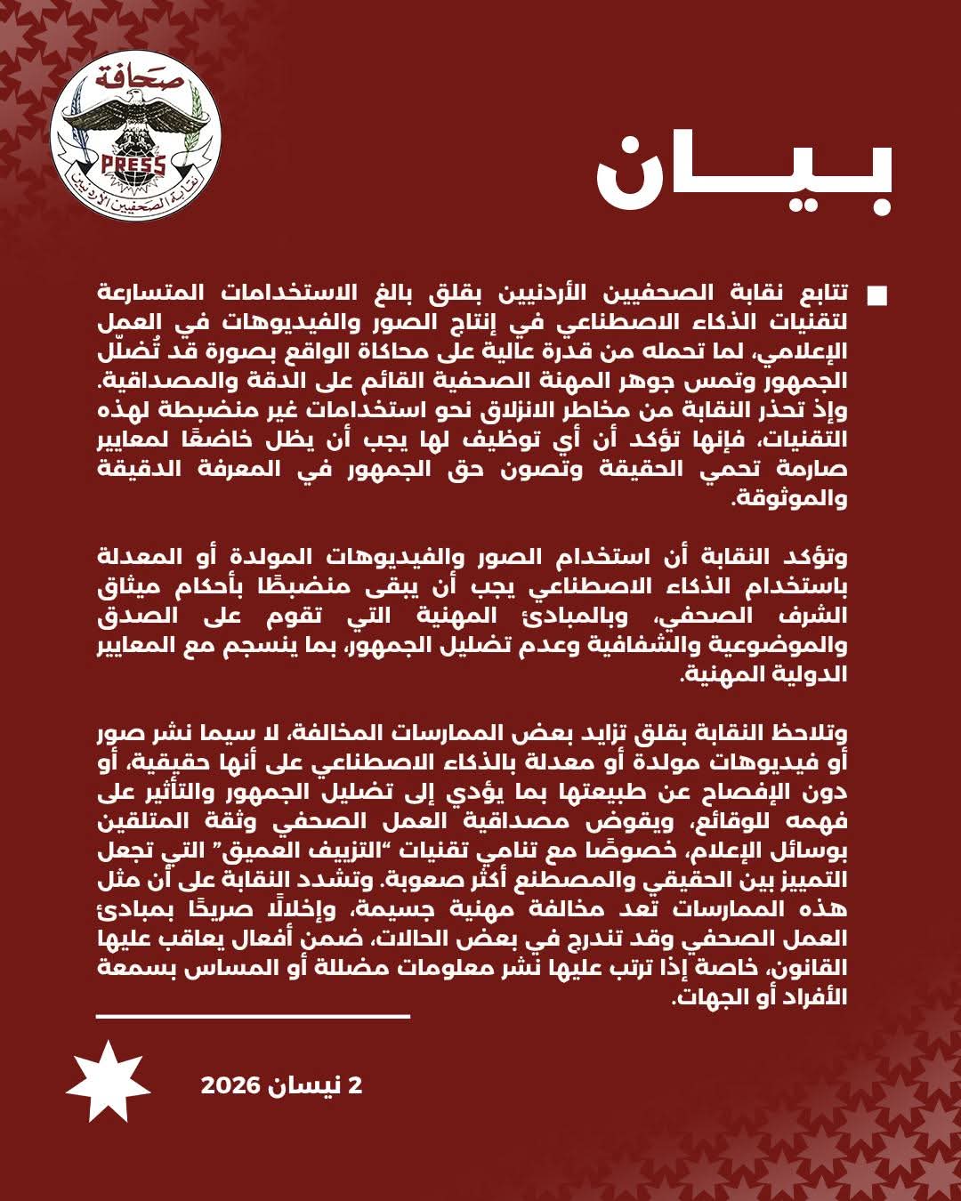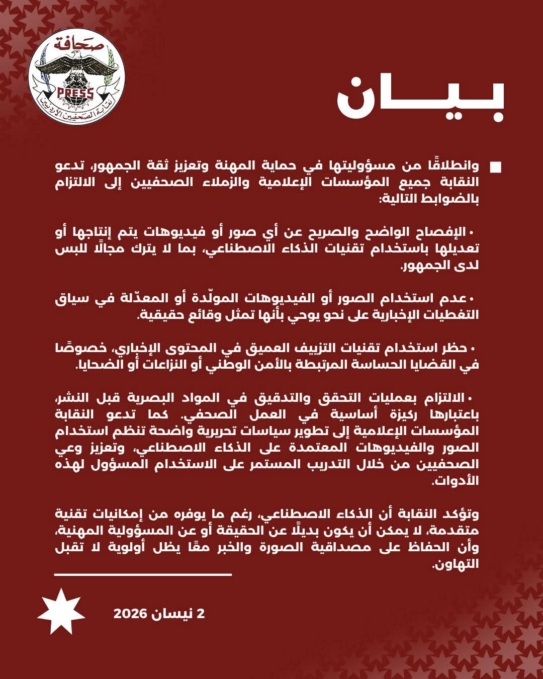 تتابع نقابة الصحفيين الأردنيين بقلق بالغ الاستخدامات المتسارعة لتقنيات الذكاء الاصطناعي في إنتاج الصور والفيديوهات في العمل الإعلامي، لما تحمله من قدرة عالية على محاكاة الواقع بصورة قد تُضلل الجمهور وتمس جوهر المهنة الصحفية القائم على الدقة والمصداقية.