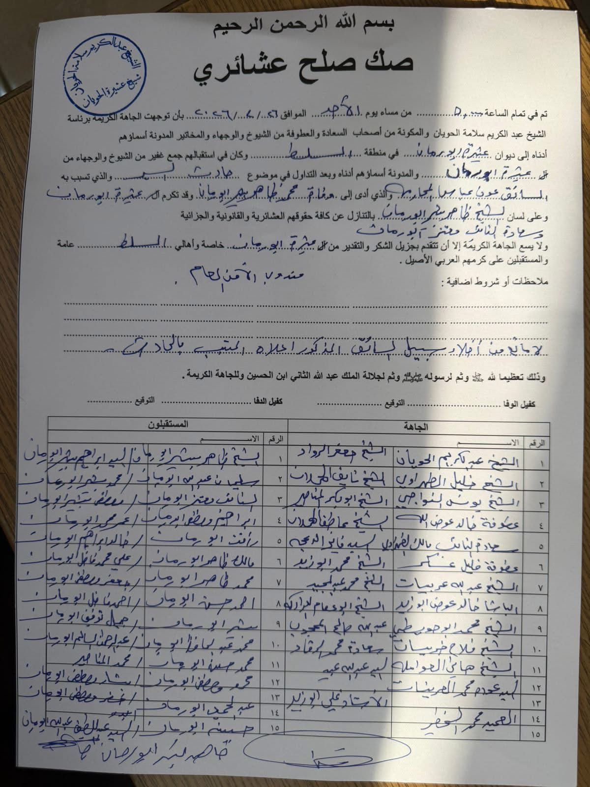 وقد أصرت الجاهة الكريمة، برئاسة الشيخ عبد الكريم الحويان، وبعد قبول الصلح وشرب القهوة، على تقديم الدية الشرعية كاملة، وضمان جميع حقوق أبناء المرحوم (أطفاله الثلاثة) وزوجته، في موقفٍ نبيل يجسّد التزام الأردنيين بالعدل إلى جانب التسامح، ويؤكد أن الصلح الحقيقي لا يكتمل إلا بردّ الحقوق وصون الكرامات وجبر الخواطر.