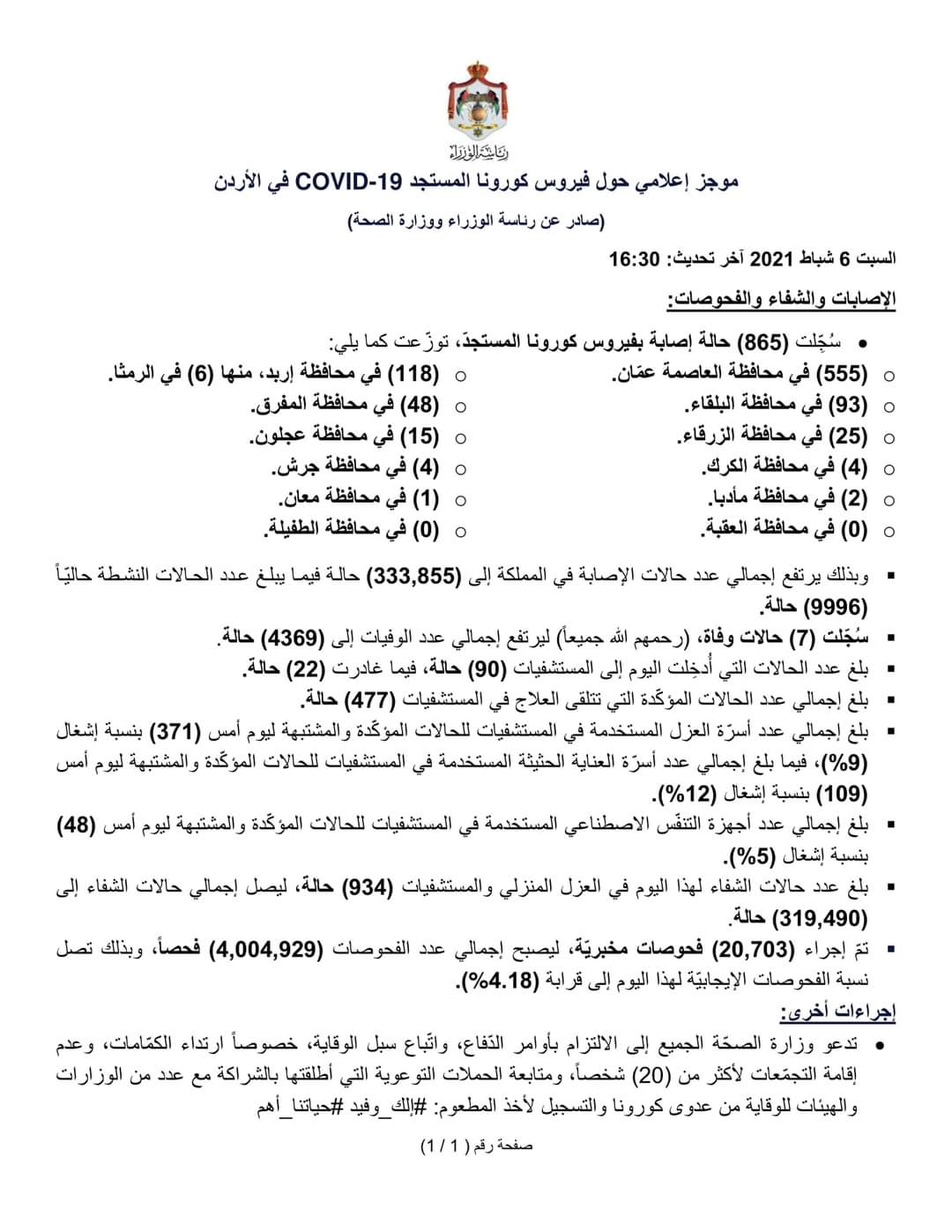 (555) في محافظة العاصمة عمّان.(118) في محافظة إربد، منها (6) في الرمثا.(93) في محافظة البلقاء.(48) في محافظة المفرق.(25) في محافظة الزرقاء.(15) في محافظة عجلون.(4) في محافظة الكرك.(4) في محافظة جرش.(2) في محافظة مأدبا.(1) في محافظة معان.(0) في محافظة العقبة.(0) في محافظة الطفيلة.وبذلك يرتفع إجمالي عدد حالات الإصابة في المملكة إلى (333,855) حالة فيما يبلغ عدد الحالات النشطة حاليّاً (9996) حالة.سُجّلت (7) حالات وفاة، (رحمهم الله جميعاً) ليرتفع إجمالي عدد الوفيات إلى (4369) حالة.بلغ عدد الحالات التي أُدخِلت اليوم إلى المستشفيات (90) حالة، فيما غادرت (22) حالة.بلغ إجمالي عدد الحالات المؤكّدة التي تتلقى العلاج في المستشفيات (477) حالة.بلغ إجمالي عدد أسرّة العزل المستخدمة في المستشفيات للحالات المؤكّدة والمشتبهة ليوم أمس (371) بنسبة إشغال (9%)، فيما بلغ إجمالي عدد أسرّة العناية الحثيثة المستخدمة في المستشفيات للحالات المؤكّدة والمشتبهة ليوم أمس (109) بنسبة إشغال (12%).بلغ إجمالي عدد أجهزة التنفّس الاصطناعي المستخدمة في المستشفيات للحالات المؤكّدة والمشتبهة ليوم أمس (48) بنسبة إشغال (5%).بلغ عدد حالات الشفاء لهذا اليوم في العزل المنزلي والمستشفيات (934) حالة، ليصل إجمالي حالات الشفاء إلى (319,490) حالة.تمّ إجراء (20,703) فحوصات مخبريّة، ليصبح إجمالي عدد الفحوصات (4,004,929) فحصاً، وبذلك تصل نسبة الفحوصات الإيجابيّة لهذا اليوم إلى قرابة (4.18%).