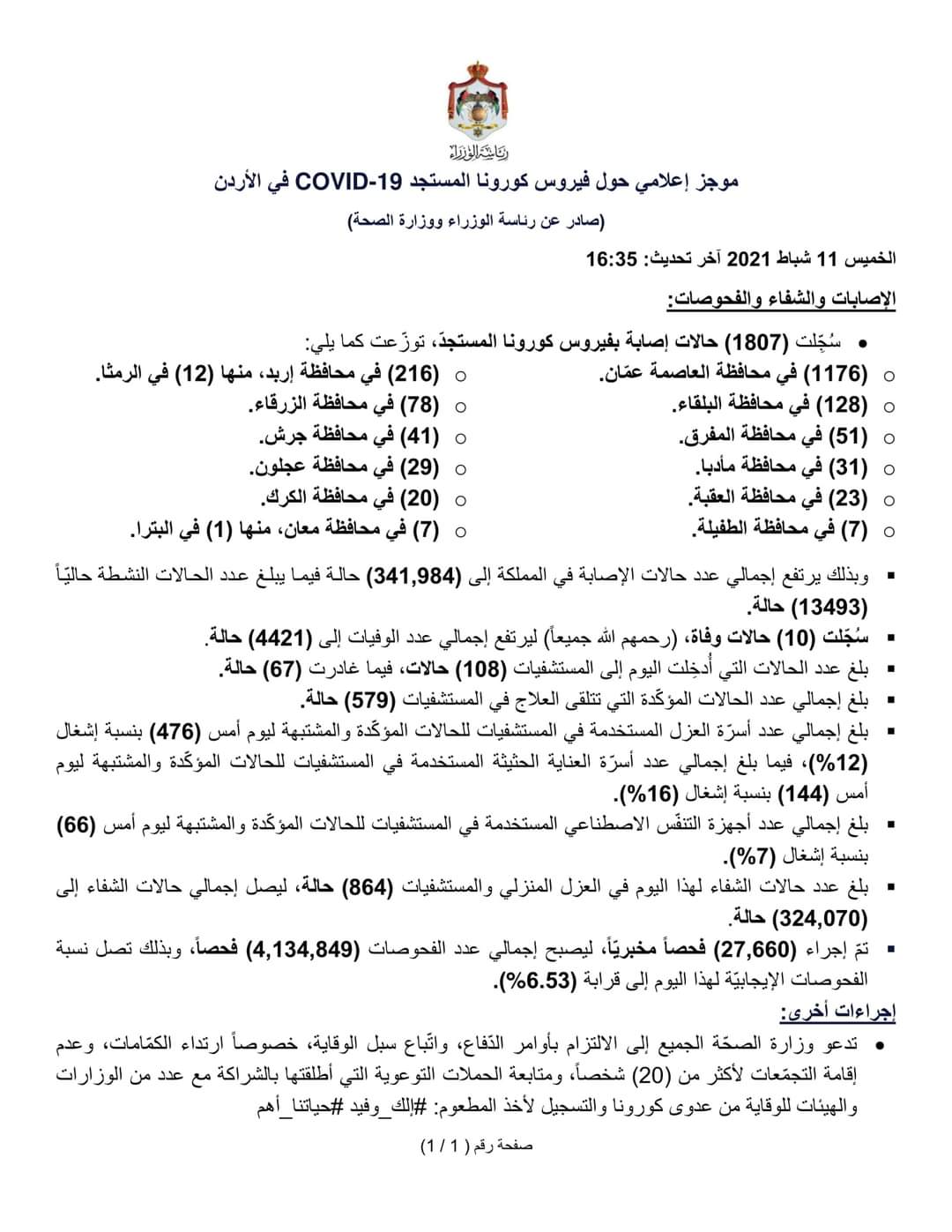 (1176) في محافظة العاصمة عمّان.(216) في محافظة إربد، منها (12) في الرمثا.(128) في محافظة البلقاء.(78) في محافظة الزرقاء.(51) في محافظة المفرق.(41) في محافظة جرش.(31) في محافظة مأدبا.(29) في محافظة عجلون.(23) في محافظة العقبة.(20) في محافظة الكرك.(7) في محافظة الطفيلة.(7) في محافظة معان، منها (1) في البترا.وبذلك يرتفع إجمالي عدد حالات الإصابة في المملكة إلى (341,984) حالة فيما يبلغ عدد الحالات النشطة حاليّاً (13493) حالة.سُجّلت (10) حالات وفاة، (رحمهم الله جميعاً) ليرتفع إجمالي عدد الوفيات إلى (4421) حالة.بلغ عدد الحالات التي أُدخِلت اليوم إلى المستشفيات (108) حالات، فيما غادرت (67) حالة.بلغ إجمالي عدد الحالات المؤكّدة التي تتلقى العلاج في المستشفيات (579) حالة.بلغ إجمالي عدد أسرّة العزل المستخدمة في المستشفيات للحالات المؤكّدة والمشتبهة ليوم أمس (476) بنسبة إشغال (12%)، فيما بلغ إجمالي عدد أسرّة العناية الحثيثة المستخدمة في المستشفيات للحالات المؤكّدة والمشتبهة ليوم أمس (144) بنسبة إشغال (16%).بلغ إجمالي عدد أجهزة التنفّس الاصطناعي المستخدمة في المستشفيات للحالات المؤكّدة والمشتبهة ليوم أمس (66) بنسبة إشغال (7%).بلغ عدد حالات الشفاء لهذا اليوم في العزل المنزلي والمستشفيات (864) حالة، ليصل إجمالي حالات الشفاء إلى (324,070) حالة.تمّ إجراء (27,660) فحصاً مخبريّاً، ليصبح إجمالي عدد الفحوصات (4,134,849) فحصاً، وبذلك تصل نسبة الفحوصات الإيجابيّة لهذا اليوم إلى قرابة (6.53%).