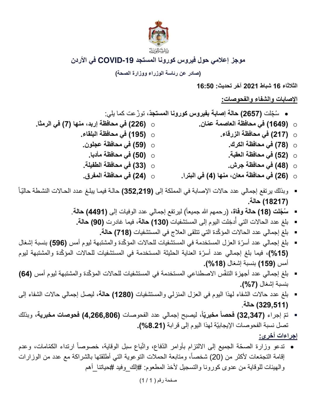 (1649) في محافظة العاصمة عمّان.(226) في محافظة إربد، منها (7) في الرمثا.(217) في محافظة الزرقاء.(195) في محافظة البلقاء.(78) في محافظة الكرك.(59) في محافظة عجلون.(52) في محافظة العقبة.(50) في محافظة مأدبا.(48) في محافظة جرش.(33) في محافظة الطفيلة.(26) في محافظة معان، منها (4) في البترا. (24) في محافظة المفرق.وبذلك يرتفع إجمالي عدد حالات الإصابة في المملكة إلى (352,219) حالة فيما يبلغ عدد الحالات النشطة حاليّاً (18217) حالة.سُجّلت (18) حالة وفاة، (رحمهم الله جميعاً) ليرتفع إجمالي عدد الوفيات إلى (4491) حالة.بلغ عدد الحالات التي أُدخِلت اليوم إلى المستشفيات (130) حالة، فيما غادرت (90) حالة.بلغ إجمالي عدد الحالات المؤكّدة التي تتلقى العلاج في المستشفيات (718) حالة.بلغ إجمالي عدد أسرّة العزل المستخدمة في المستشفيات للحالات المؤكّدة والمشتبهة ليوم أمس (596) بنسبة إشغال (15%)، فيما بلغ إجمالي عدد أسرّة العناية الحثيثة المستخدمة في المستشفيات للحالات المؤكّدة والمشتبهة ليوم أمس (159) بنسبة إشغال (18%).بلغ إجمالي عدد أجهزة التنفّس الاصطناعي المستخدمة في المستشفيات للحالات المؤكّدة والمشتبهة ليوم أمس (64) بنسبة إشغال (7%).بلغ عدد حالات الشفاء لهذا اليوم في العزل المنزلي والمستشفيات (1280) حالة، ليصل إجمالي حالات الشفاء إلى (329,511) حالة.تمّ إجراء (32,347) فحصاً مخبريّاً، ليصبح إجمالي عدد الفحوصات (4,266,806) فحوصات مخبرية، وبذلك تصل نسبة الفحوصات الإيجابيّة لهذا اليوم إلى قرابة (8.21%).