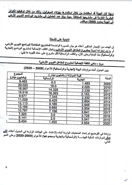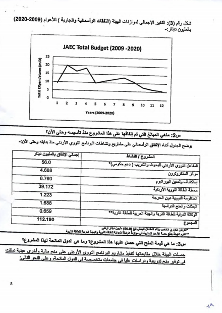 وأشار إلى اقتراض الهيئة 56 مليون دينار من كوريا الجنوبية بفائدة 0.2% ويسدد على 30 عاما مع مهلة 10 أعوام وتم إنفاقه على بناء المفاعل النووي البحثي، إضافة إلى 600 أف دولار سنويا من الوكالة الدولية للطاقة الذرية.