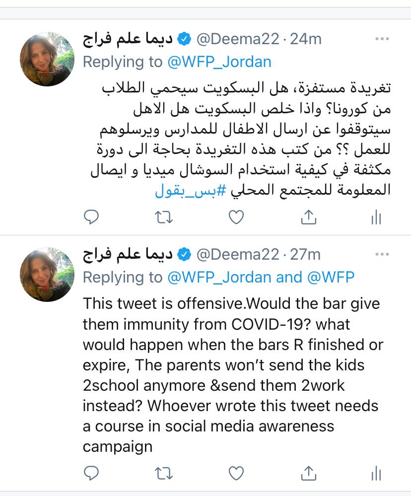 ونشر برنامج التغذية بعد حذف التغريدة الأولى: "يعتذر برنامج الأغذية العالمي في الأردن عن التغريدة التي تشير إلى البسكويت المحشو بالتمر والمدعم بالفيتامينات والمعادن التابع لبرنامج الأغذية العالمي، وذلك لعدم صياغتها بشكل صحيح".