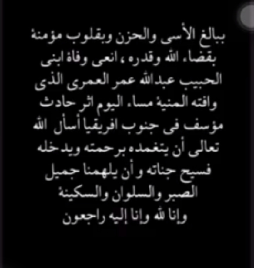 ونعى والد العمري ابنه عبر مواقع التواصل الاجتماعي، داعياً الله أن يتغمده واسع رحمته.