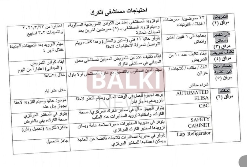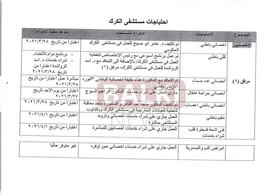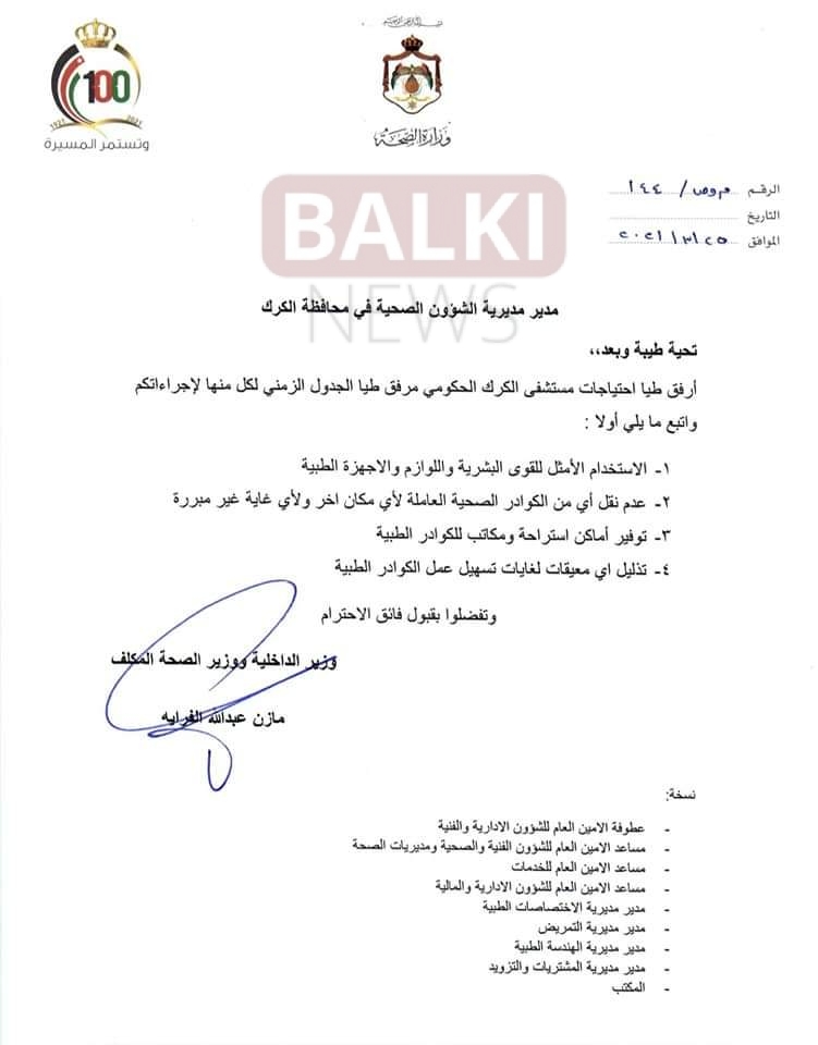 اوعز وزير الصحة المكلف مازن الفراية بتلبية إحتياجات مستشفى الكرك الحكومي من عدد من التخصصات الطبية .