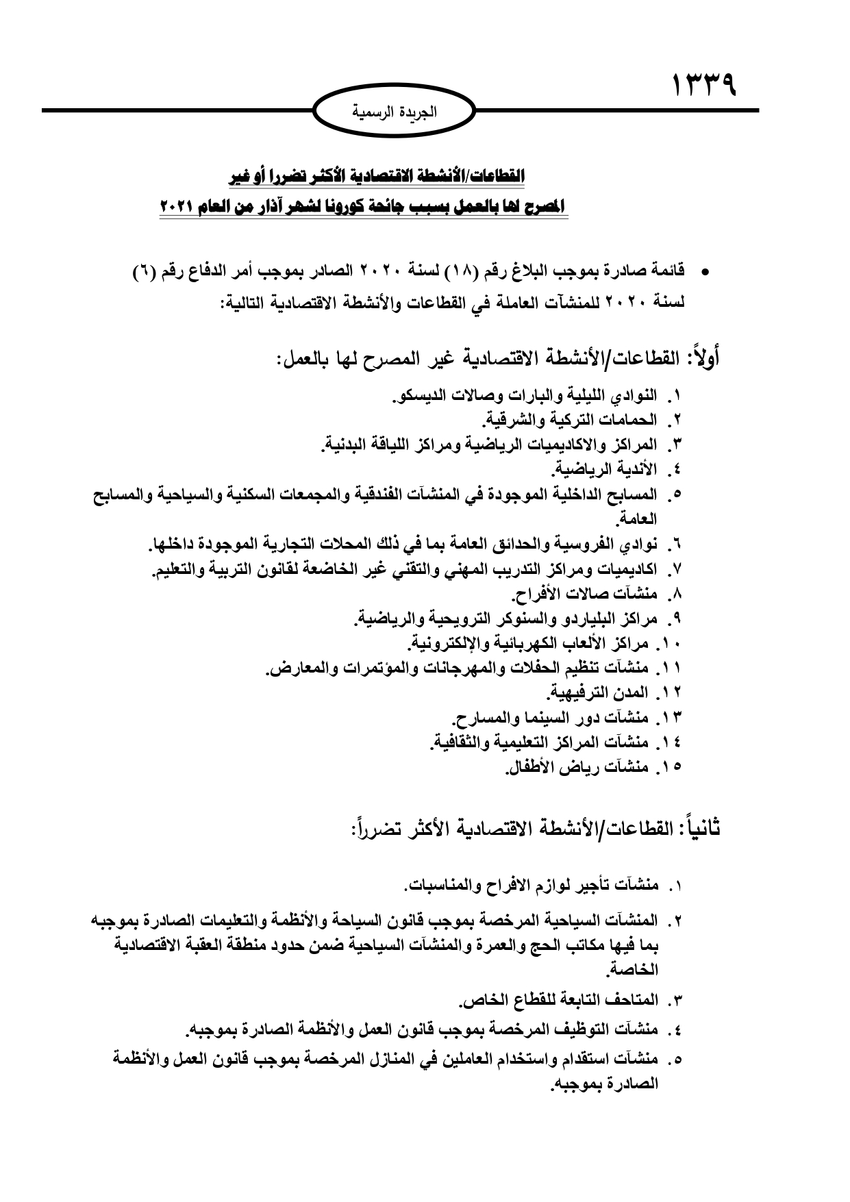 نشرت الحكومة في عدد الجريدة الرسمية الصادر الخميس، قائمة القطاعات الأكثر تضررا من الجائحة أو غير المصرح لها لشهر آذار.