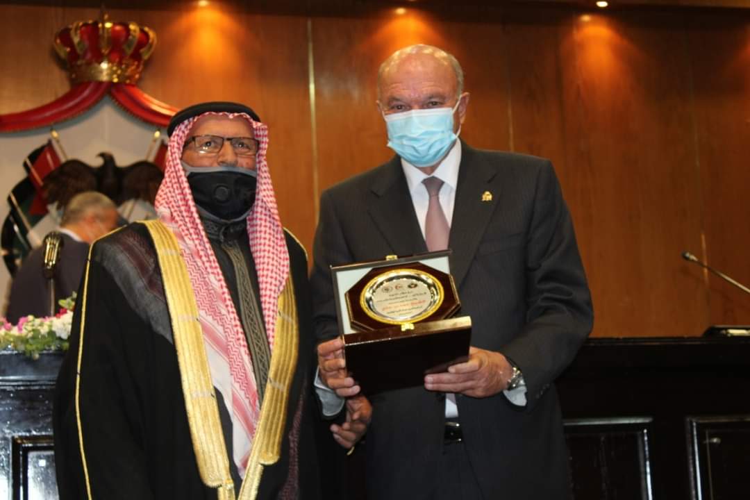 وفي نهاية الحفل، جرى تكريم طاهر المصري، والراحلين عودة ابو تايه، وعبدالله العزب، وحمد بن جازي ومحمد نزال العرموطي، وتيسير ظبيان، اضافة إلى تكريم رئيس المؤتمر راعي الحفل فيصل الفايز.