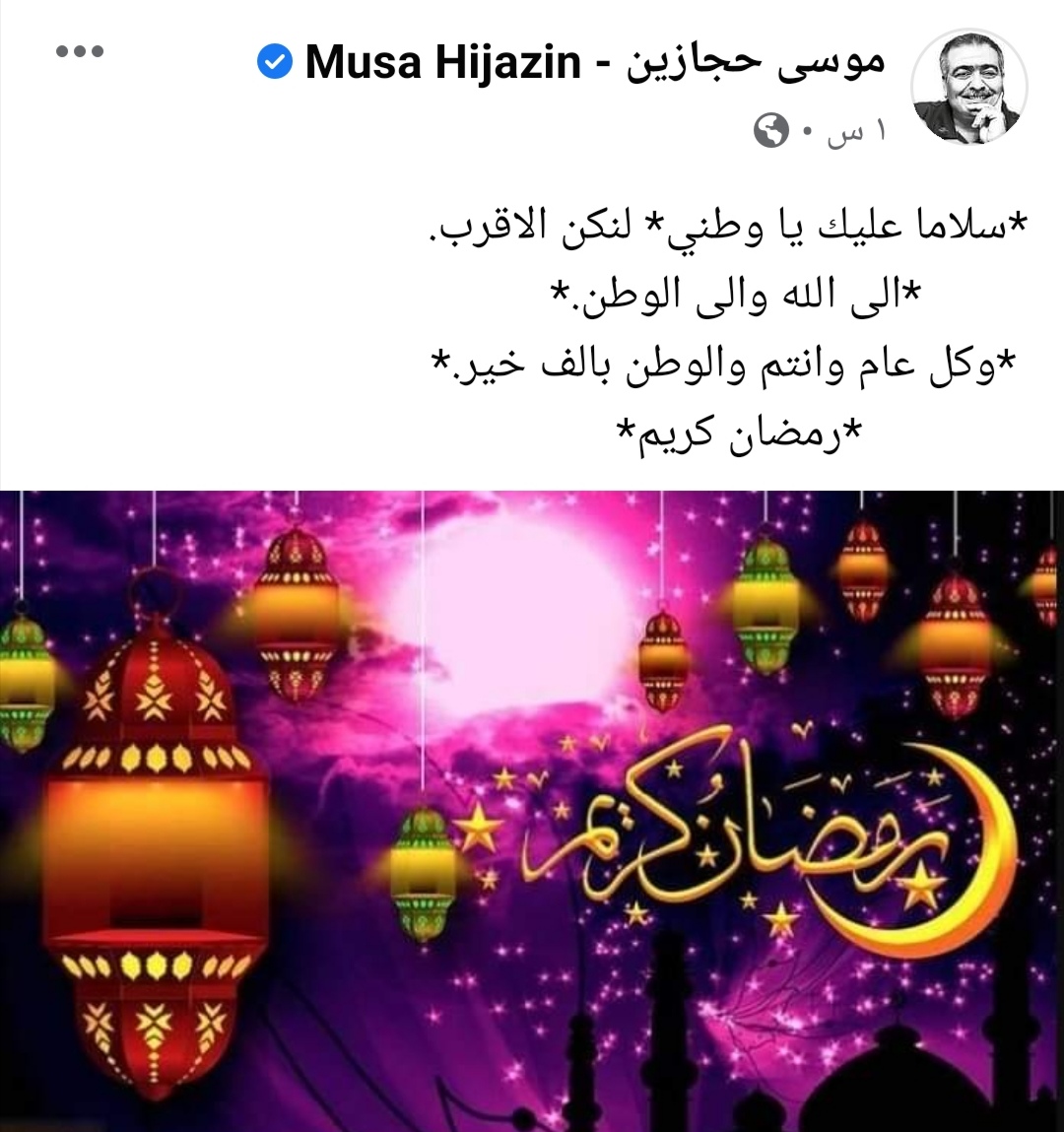 فنان الشعب:الفنان الأردني "موسى حجازين" يكتب.. سلاما عليك يا وطني لنكن الاقرب الى الله والى الوطن وكل عام وانتم والوطن بالف خير( رمضان كريم)