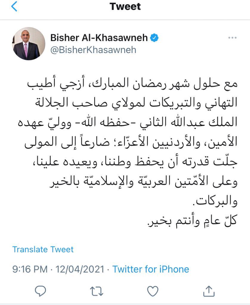 رئيس الوزراء الدكتور بشر الخصاونة : ‏مع حلول شهر رمضان المبارك، أزجي أطيب التهاني والتبريكات لمولاي صاحب الجلالة الملك عبدالله الثاني -حفظه الله- ووليّ عهده الأمين، والأردنيين الأعزّاء؛ ضارعاً إلى المولى جلّت قدرته أن يحفظ وطننا، ويعيده علينا، وعلى الأمّتين العربيّة والإسلاميّة بالخير والبركات.