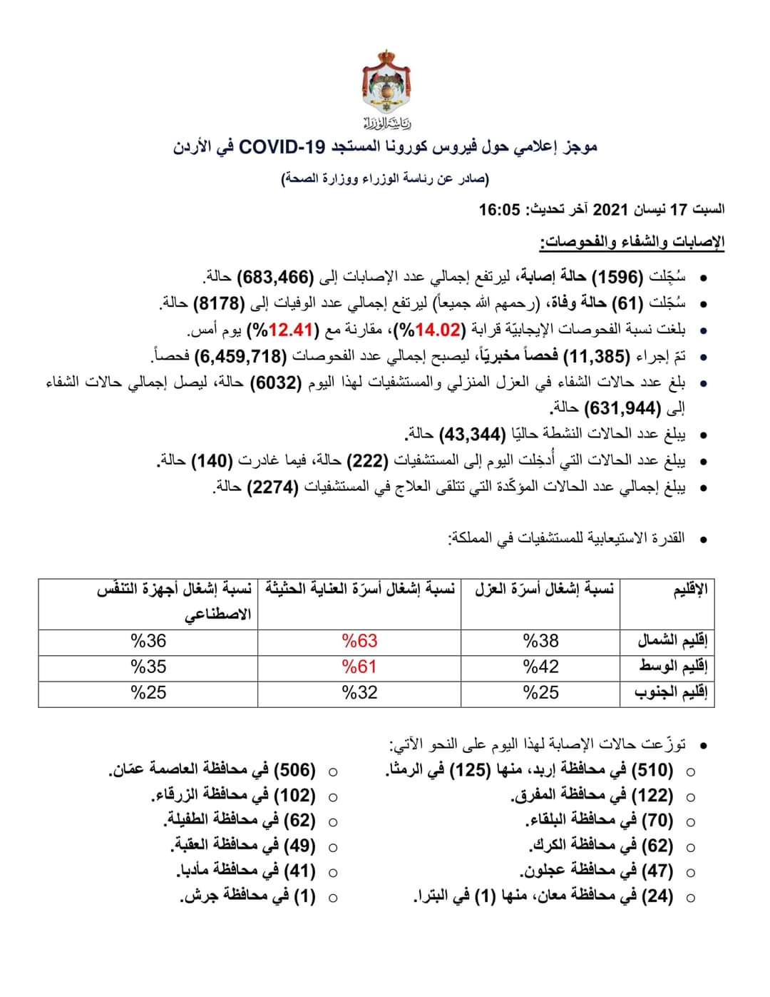 سجل في المملكة اليوم 61 حالة وفاة و 1596 إصابة بفيروس كورونا
