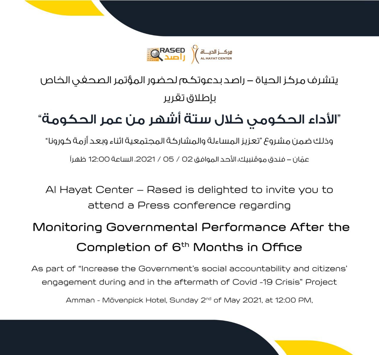 يتشرف مركز الحياة -راصد بدعوتكم لحضور المؤتمر الصحفي الخاص بإطلاق التقرير الخاص بالأداء الحكومي خلال فترة الستة شهور الأولى من عمر الحكومة وذلك في إطار مشروع "تعزيز المساءلة والمشاركة المجتمعية أثناء وبعد أزمة كورونا"