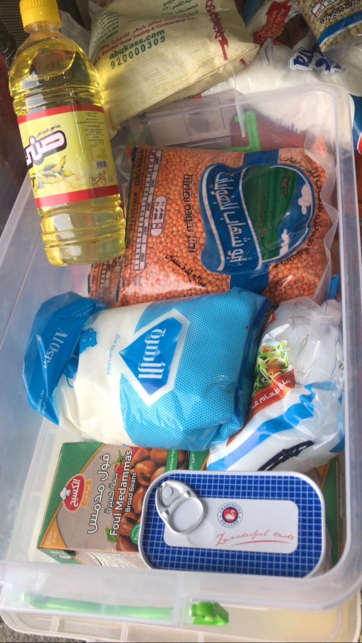 سلال الخير على بعض المحلات المتعاونة ليقوم المواطن بوضع ما تيسر له من المواد التموينية المتنوعة، ومن ثم يقوم متطوعين بتجهيز طرود خير ليصار إلى توزيعها على الأسر العفيفة”.