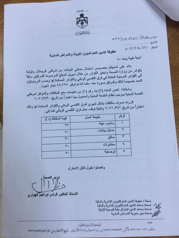 قرر وزير الصحة الدكتور فراس الهواري صرف مكافآت بشكل شهري لفرق التقصي الوبائي والكوادر المساندة لها اعتبارا من مطلع آذار الماضي وحتى انتهاء الفرق من عملها.