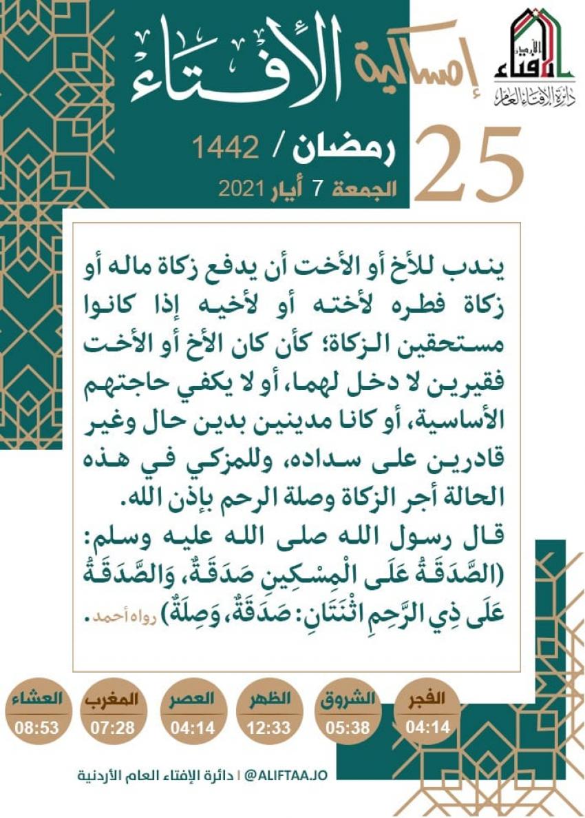 أكدت دائرة الافتاء الأردنية جواز دفع زكاة الأموال وزكاة الفطر للأشقاء والشقيقات في حال استحقاقهم لها.
