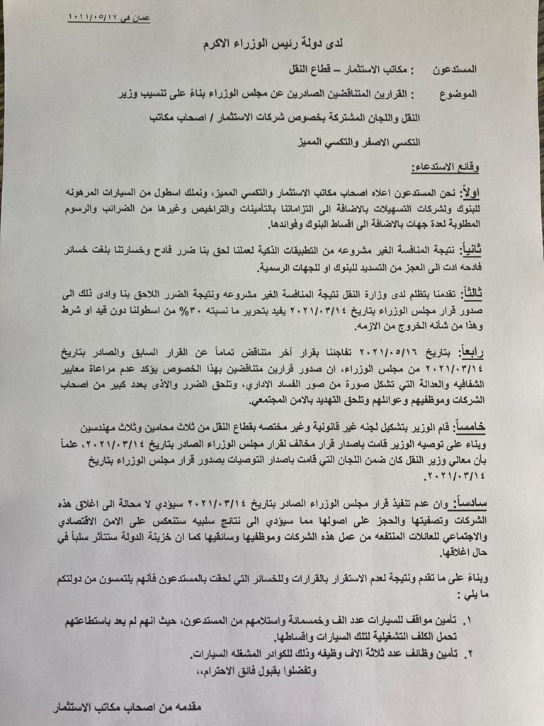 وسرد اصحاب المكاتب حيثيات قضيتهم منذ البداية قائلين: إن عدم تنفيذ قرار مجلس الوزراء الصادر منتصف شهر 3 - 2021 سيؤدي الى اغلاق هذه الشركات وتصفيتها والحجز على اصولها ما سيؤدي في النتيجة إلى انعكاس ذلك على الامن الاقتصادي والاجتماعي للعائلات المنتفعة من عمل هذه الشركات وموظفيها وسائقيها كما ان خزينة الدولة ستتأثر سلبا في حال اغلاقها.