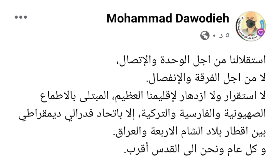 لا استقرار ولا ازدهار لإقليمنا العظيم، المبتلى بالاطماع الصهيونية والفارسية والتركية، إلا باتحاد فدرالي ديمقراطي بين اقطار بلاد الشام الاربعة والعراق.