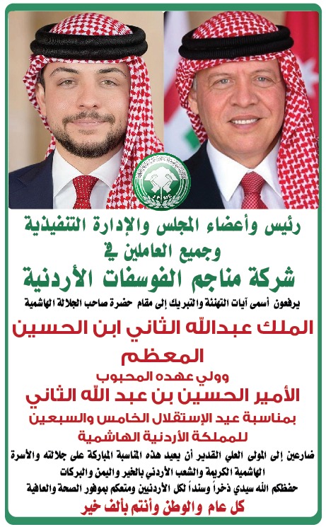احتفلت شركة مناجم الفوسفات الأردنية بعيد استقلال المملكة الاردنية الهاشمية الـ 75، الذي يصادف اليوم 25 ايار 2021. وتتزين بالإعلام الاردنية