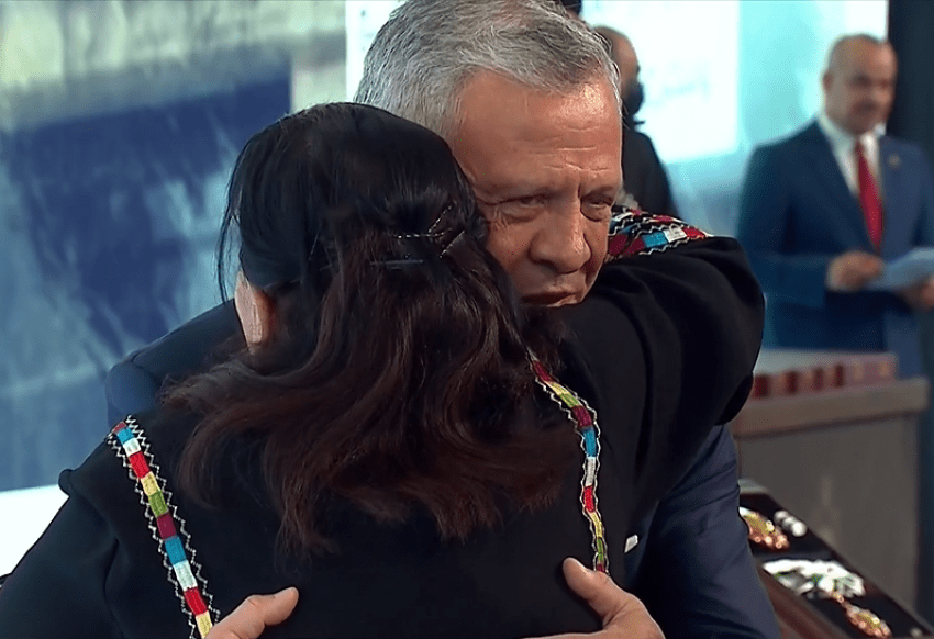 كما ترك جلالة الملك موقعه، متوجها إلى السيدة هيفاء البشير من أبرز رائدات العمل التطوعي منذ أكثر من 70 عاما، مختصرا عليها مسافة الوصول الى منصة التكريم، وعانقها، ثم عانق جلالته السيدة صيتة الحديد من رائدات العمل الخيري.