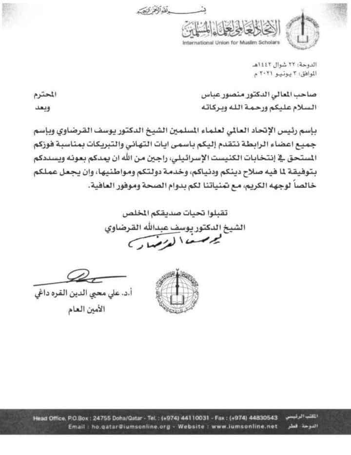 نشرت في بعض وسائل الإعلام رسالة موقعة عليها من قبل فضيلة الشيخ يوسف القرضاوي، والشيخ علي القره داغي، بأنهما يهنئان المدعو منصور عباس.