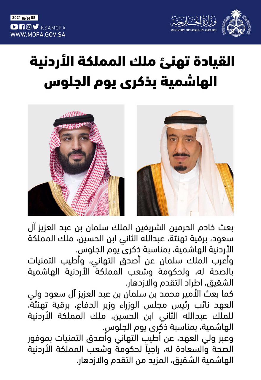 الملك يتلقى برقيتي تهنئة من خادم الحرمين الشريفين وولي عهده بعيد الجلوس