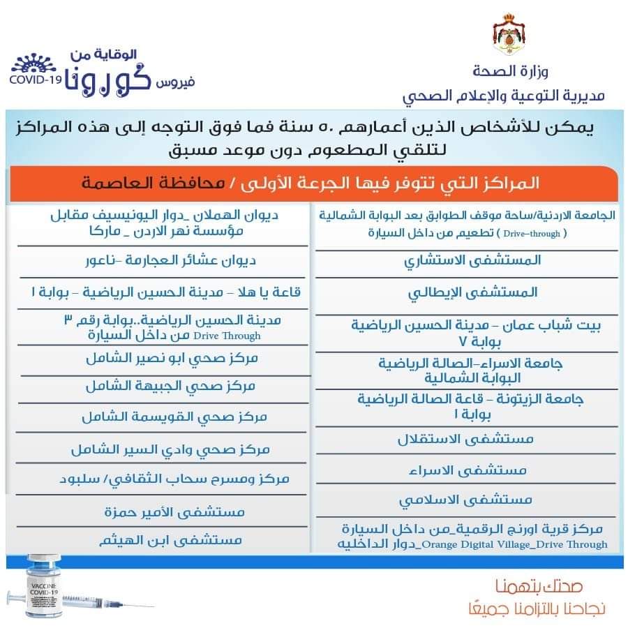 المراكز التي تتوفر فيها الجرعه الاولى لمطعوم فيروس كورونا لهذا اليوم 27/6/2021 حيث يمكن للاشخاص الذين اعمارهم فوق 50 عاما التوجه اليوم الاحد الى هذه المراكز و تلقي المطعوم دون موعد مسبق