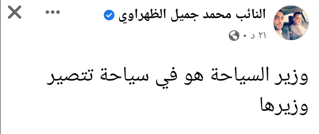 وقال الظهراوي في منشورة ” وزير السياحة هو في سياحة تتصير وزيرها ” .